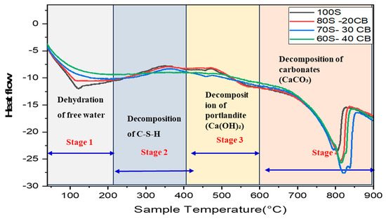 The prominent endothermic peak near 600–900 °C is attributed to the dissociation of calcium carbonate (CaCO3) into calcium oxide and carbon dioxide. It is worth noting that the intensity of these endothermic reactions increased with increasing CBA content, especially in the 60S-40CB sample, indicating greater thermal activity and increased phase transformations. This behavior suggests that increasing the content of CBAs introduces thermally sensitive phases or increases the porosity, facilitating decomposition reactions. However, the overall thermal response remained similar across all mixtures.