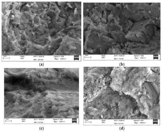 Figure 16 shows SEM images of the sample (100S) (100% sand control mixture), which illustrate considerable growth in porosity as well as the formation of microcracks. From the SEM image, it can be noticed that the interfacial transition zones (ITZs) between the aggregated aggregate and cement paste become more evident, which may constitute weak points within the structure. The CSH gel also appeared less cohesive and the matrix showed increased structural variation. The SEM image shows a slightly less dense structure than the control sample in the (80S-20CB) sample, where CBAs replaced 20% of the sand. Small gaps and microcracks begin to appear, most likely because of the introduction of aggregates, which can create areas with weaker bonds. However, the overall structure remained relatively compact with a good distribution of C-S-H gels throughout the matrix. The (70S-30CB), with 30% sand replaced by aggregate, showed a dense, cohesive microstructure with very low porosity. The hydration products appear well-developed, with tightly packed C-S-H phases and an almost complete absence of microcracks or interstices. This dense structure contributes to the high mechanical strength and thermal stability of the control mixture. The absence of weak transition zones or loose bonds reflects the homogeneity of concrete. The SEM image reveals a noticeably porous and heterogeneous structure in the sample (60S-40CB), with 40% of the sand replaced by aggregates. Large gaps and areas with weak bonds are visible, along with increased microcracks [53]. The CSH gel appeared more friable and less homogeneously distributed [84], indicating that a high proportion of aggregated aggregates significantly weakened the matrix cohesion [85]. The interfacial transition zones also became more pronounced, reflecting the weakening of the bonds between the aggregate and the cement paste.