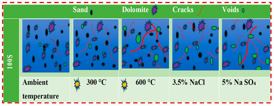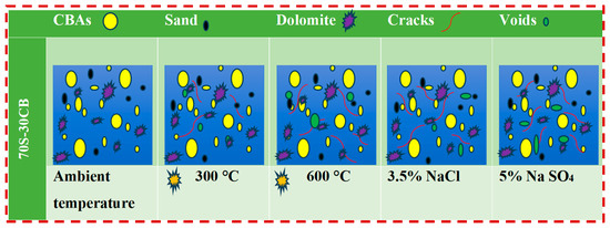The mixture with a 30% replacement ratio (70S-30CB) exhibited the highest thermal resistance, retaining a strength of 119.24 MPa, with a reduction of only 13.1%. At 40% and 50% replacement ratios (60S-40CB and 50S-50CB), the compressive strengths decreased to 115.59 MPa and 113.20 MPa, representing a 12.5% and 13.6% decrease, respectively. At 300 °C, all mixtures showed a moderate compressive strength reduction compared to room temperature owing to several main processes. Free water began to evaporate from the capillary pores at temperatures between 100 °C and 150 °C, which increased the porosity of the concrete matrix and weakened its structure. In addition, the dewatering process of C-S-H, the primary binder in concrete, begins, resulting in associated chemical water loss and a decrease in bond strength. The differences in thermal expansion that occur between the aggregate and the cement paste give rise to the internal stress which in turn creates micro cracks [66]. Together, these effects explain the decrease in the compressive strength of all mixtures at 300 °C. The strength of the standard mixture (100S) decreased from 122.19 MPa at 25 °C to 108.28 MPa at 300 °C, while the mixture with a 30% replacement ratio (70S-30CB) retained the highest thermal resistance, as its strength decreased from 137.28 MPa to 119.24 MPa. Pascal showed better stability than other mixtures because of the formation of stable compounds such as potassium silicate (K2SiO3) and a denser microstructure [67,68,69].