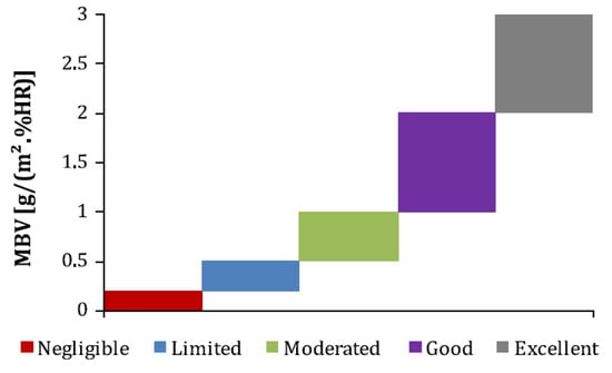 | Samples ID | Total Porosity n (-) | MBV After 10 Cycles of 24 h (g/m2 %RH) | NORDTEST Classification [57] |