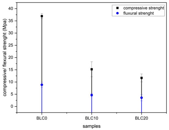 - Despite increased porosity, mechanical strength remained within acceptable limits for non-structural applications. The compressive strength of BLC20 reached 11.68 MPa, with a flexural strength of 3.58 MPa. The fibrous structure of OH contributed to improved ductility and crack-bridging effects, partially compensating for strength losses due to increased porosity. These results reflect a favorable balance between thermal/hygric benefits and mechanical integrity.