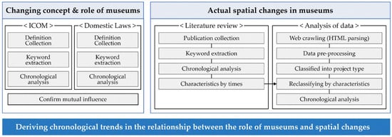 This study aims to identify the relationship between the expansion of museums’ role and trends in spatial changes through analysis. The characteristics of the collected literature and data appropriately combined quantitative and qualitative research methodologies which continuously inform each other: (ⅰ) to clarify the changing concept and expanding role of museums, keywords are selected from the definitions of museums in ICOM and South Korean laws by year, and trends in the change are derived; (ⅱ) to identify actual spatial changes in museums, the changes in facilities and operational plans published by the National Museum of Korea were chronologically examined and trends in museum spatial changes over time were identified based on quantitative trends in procured projects. The detailed composition can be found in Figure 1 and the description below.