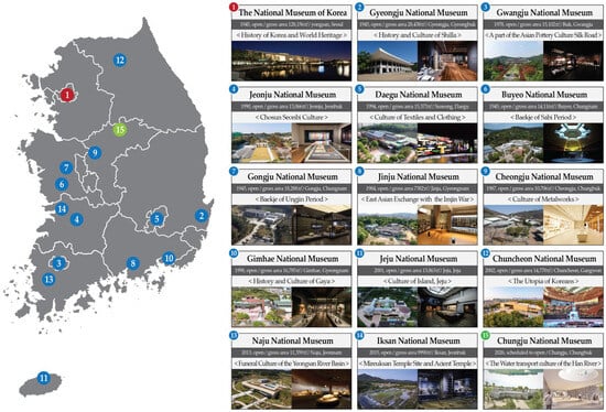 From that point onward, the National Museum of Korea expanded by introducing local museums centered on the historic capital such as Gyeongju, Gongju, and Buyeo. In June 1990, the Ministry of Culture’s 10-Year Plan for Cultural Development Report proposed expanding the National Museum of Korea and local museums, increasing their number while ensuring regional equity (Figure 2) [].