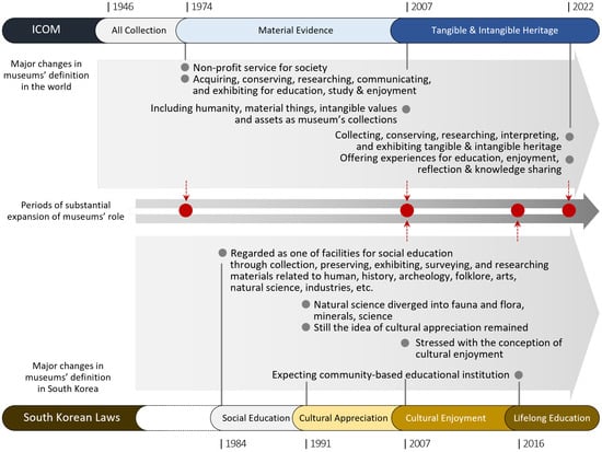 Chronological change in the museum’s definition in International Council of Museums and South Korean Laws. (Red dots represent significant museums’ role expansion).