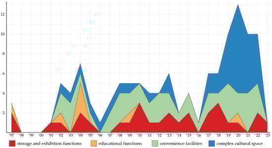 Facilities are classified into project types, including new constructions (“NEW”), building annex construction (“ANX”), making extension (“EXT”), changing spatial layout (“SPL”), environmental renovation (“ENV”), and exhibition renewal (“EXH”). Data on these projects, ordered by year, are collected and analyzed using the government’s e-procurement system to confirm actual changes to the facilities. By analyzing and visualizing changes in functional areas and spaces over time along with their characteristics, changes in the role of museums and the corresponding changes in space are identified. Furthermore, it highlights the quantitative changes in space and the introduction of new functions, enabling the identification of key trends.