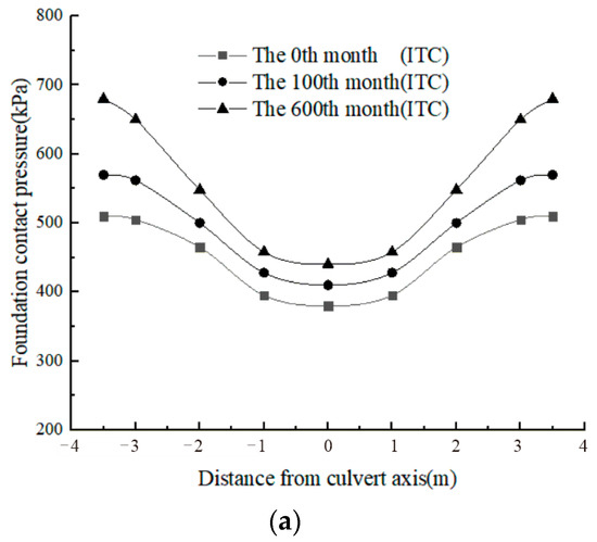 Figure 7 illustrates the distribution of VEP on the culvert roof plane. For the condition with EPS, the VEP acting on the culvert roof slab is less than the backfill overburden pressure; it nonlinearly decreases with time. While the VEP on both sides at the culvert roof plane is larger than the backfill overburden pressure, it increases nonlinearly with time due to the compressible EPS board on the culvert roof, resulting in differential settlement between the central and surrounding soil mass; consequently, partial earth pressure on the culvert roof slab is transferred to the surrounding soil mass.