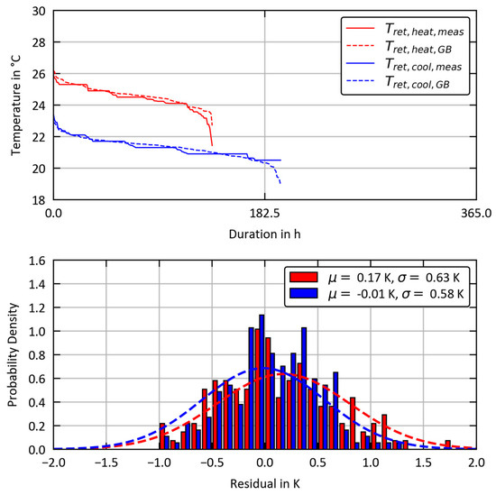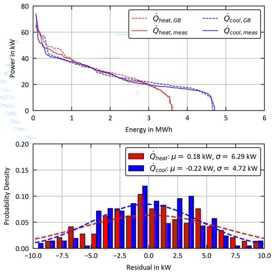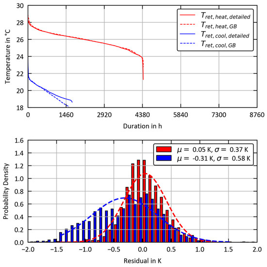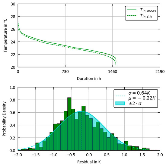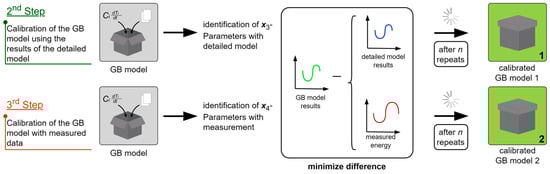 The developed GB model was established in two versions: GB1, for which the parameters were identified using the results from the detailed model, and GB2, using experimental data. The second step (Figure 2) was achieved by comparing the results from the GB1 model with those from the detailed model and formulating an optimization problem. Furthermore, the parameters for the GB2 model were also identified using measured data, which included heat flows collected over a two-month period that included cooling, heating, and transition periods (third step). In formulating the optimization problem, an attempt was made to use the information available for the respective comparison model for each model. This resulted in different target functions to avoid overfitting and to speed up the identification process.