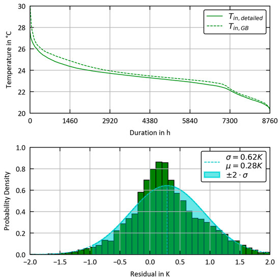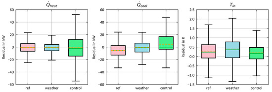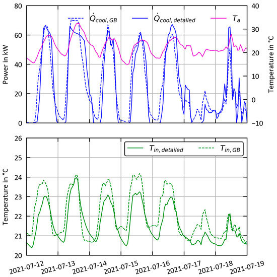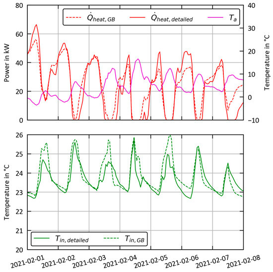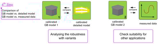 In the fourth step (Figure 3), the robustness of the GB model was analyzed. Two additional variants were defined for the comparison of the GB1 model with the detailed model. For this purpose, the validated models (both detailed and GB1) were simulated and compared using different weather data and an alternative control strategy. Finally, the calibrated GB2 model was compared with real-time measured data to assess its suitability for other applications.