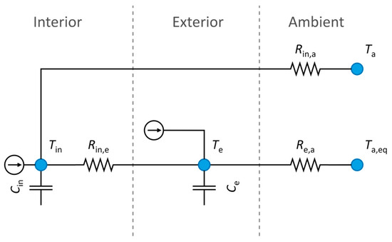 The heat exchange between the two capacities is assumed to be purely convective. The resistance reflects the area-weighted heat transfer resistance of a vertical and horizontal wall. The fshape factor represents the ratio of vertical-to-horizontal area. The relationship between the temperatures (to the power of 0.31) was adopted from [48]. The factor of 1.31 in Equation (8) arises from the combined effect of two dependencies: the non-linear relationship of Rin,e (raised to the power of 0.31) and the linear relationship between the node temperatures of the heat flow (raised to the power of 1).
