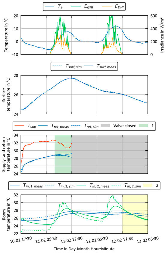 The heating-up and cooling-down experiment started on 10 February 2023 at 17:30 and was carried out until 13 February 2023 at 05:30. For this purpose, the concrete core activation was supplied with an average flow temperature of approximately 32 °C for 24 h. The building was then cooled down for 36 h. To adjust the parameters, a multi-objective optimization approach with two objective functions was used. On the one hand, the difference between the simulated and measured return temperature in the heating-up phase was used, and on the other hand, the differences in the surface temperatures of the ceiling measured during the test were used (heating-up and cooling-down phases). Two more room temperatures were used for visual cross-validation. This means that the resulting temperature profiles for these rooms were compared with the measured data solely for visual assessment, but were not included in the parameter identification process itself. The optimization process was carried out to minimize the RSE over the considered period for the target functions (5)