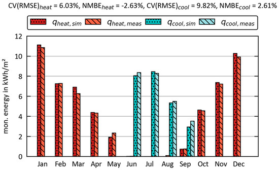 To evaluate deviations and the model accuracy, the Root-Square Error (RSE), the Coefficient of Variation of the Root-Mean-Square Error (CV(RMSE)), and the Normalized-Mean-Bias Error (NMBE) were employed. ASHRAE Guideline 14-2014 [37] outlines the requirements for building simulation, which, for monthly calibration, stand at 15% CV(RMSE) and ±5% NMBE.