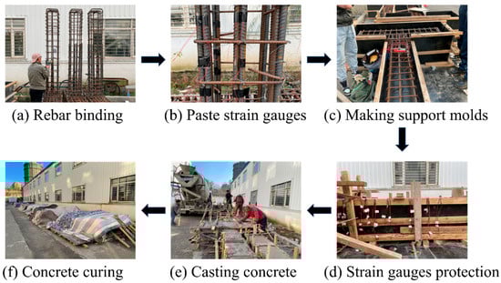 The construction process of specimens can be seen in Figure 2. Firstly, tie the steel cage, then paste strain gauges in the overlapping area of the longitudinal steel bars, place the steel cage in a wooden mold, protect the wires of the strain gauges, pour commercial C30 concrete, and, finally, perform specimen curing.