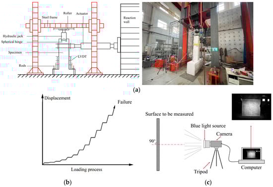 Experiment overview: (a) loading device; (b) loading pattern; (c) DIC technology measuring equipment.