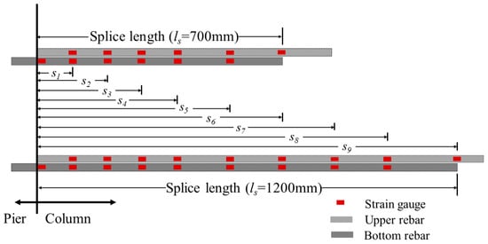Strain gauges were used to monitor the strain level of longitudinal rebar; it should be noted that this study mainly focused on the stress transfer between the lap-spliced longitudinal rebar; thus, the strain gauges on the stirrups were omitted. Details of the strain gauges are shown in Figure 4. The values from S1 to S9 are 100 mm, 200 mm, 300 mm, 400 mm, 550 mm, 700 mm, 867 mm, 1034 mm, and 1200 mm, respectively.