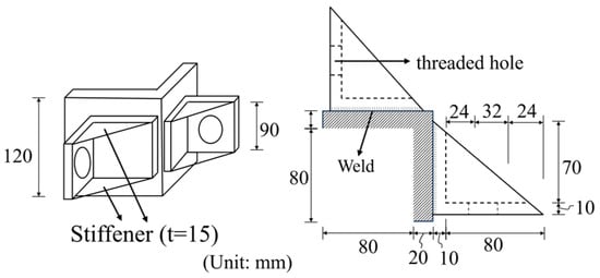 Using the proposed design method, the total calculated pretension force for the SP-35S was found to be 964.16 kN. The position parameters of the strengthening devices are as follows: The height of angle steel B is 120 mm. The number of sets along the height is n = 3, meaning the required pretension force per set for each threaded rod is 321.39 kN. The spacing C is 40 mm. The details of the device used in this test are shown in Figure 6. Each anchor rod was fastened to two angle steels using nuts. The rods were pretensioned prior to the experimental program. The pretension force was attained using a torque meter and monitored simultaneously through strain gauges affixed to selected rods before installation. A spirit level was used to ensure that each set of devices was on the same horizontal line. After careful calculation, it was determined that the dimensions and material properties of the strengthening device satisfied the required mechanical specifications.