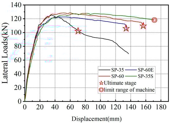 Table 1 shows the test results. It should be noted that the actual mechanical performance of the specimen SP-35S was better than the test results of this study because the machine had a limit, and the specimen SP-35S failed to reach its ultimate displacement. As a result, the nominal ultimate displacement of the SP-35S was smaller than the actual ultimate displacement. Figure 8 shows the load–displacement curves of the column specimens. The equivalent yield displacement, which is used to determine the displacement ductility, was calculated using the method proposed by Park [].