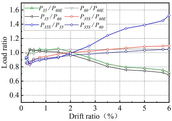 As shown in Figure 9, the authors compared the load-bearing capacity of different specimens at the same drift ratio. The SP-35S specimens exhibited a superior load-carrying capacity to the 60db specimens. This implies that, when confined using the proposed methods, columns with insufficient lap splices could potentially perform even better than those with sufficient lap splices. When comparing the P35/P60E and P35/P60 ratios in Figure 9, the load ratios remain within 10% until the drift ratio reaches 2%. However, beyond this threshold, both the P35/P60E and P35/P60 ratios decrease rapidly, indicating the significant influence of splice length on the load-carrying capacity of lap-spliced columns at large drift ratios. The P35S/P35 ratio continued to increase with the drift ratio. For example, at a drift ratio of 6%, the SP-35S specimens exhibited bearing capacities approximately 1.05 and 1.1 times higher than the SP-60 and SP-60E specimens, respectively. The P35S/P35 load ratio reaches 1.5, clearly demonstrating the strengthening effect of this proposed technique.
