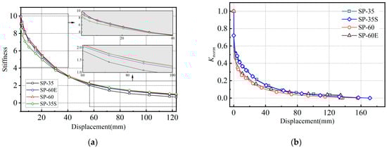 Stiffness degradation: (a) original curve; (b) normalized curve.