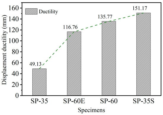 The Stiffness of the specimens is depicted in Figure 10a. The stiffness decline modes of the three non-strengthened specimens are basically the same and can be divided into three stages. In the first stage (from the beginning of the loading until the first crack appears), stiffness declines rapidly. Then, stiffness declines more slowly and finally shows little degradation. Figure 10b shows the normalized stiffness Knorm. It can be seen that, in the early stage (drift ratio < 2%), there is little difference. As lateral displacement increased, SP-35 showed the lowest stiffness. SP-35 showed the lowest stiffness. This is because SP-35 reached its ultimate displacement and failed to resist the lateral loads. This demonstrates that insufficient splice length can lead to a decrease in both load-carrying capacity and stiffness. Figure 11 shows the ductility of the specimens. The displacement ductility can be calculated as (Δu/Δy), where Δu and Δy represents the ultimate and yielding displacement of the column, respectively. When compared with SP-35, SP-60E and SP-60 showed improvements of 91.25% and 90.25%, respectively.