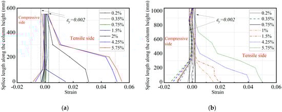 Figure 12 shows the typical strain distribution along the height of the column. SP-35 and SP-60E were chosen as examples, representing the worst and best seismic construction measures, respectively. Once the rebar strain exceeds 0.002, the longitudinal rebar is considered to have yielded. The legend in Figure 12 refers to the drift ratio. For specimen SP-35, it can be seen that the strain of the longitudinal rebar on the compressive side exceeds the yielding strain (εy = 0.002) at a height of 100 mm. This indicates that the rebar has yielded under compressive stress. On the tensile side, the rebar yields once the drift ratio reaches 2% at heights between 0 and 300 mm. This is because, with a short splice length of 700 mm, the splice bond strength is weakened. Consequently, the lap-spliced region failed to transfer stress from the bottom rebar to the top rebar. Relatively speaking, there was slip between the longitudinal rebar: the bottom rebar was stretched while the top rebar experienced lateral slip with the lateral movement of the concrete column.