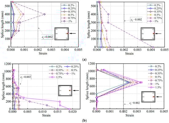 As can be seen in Figure 13, the strain in the bottom rebar decreased with increasing height from the base at each lateral drift ratio, whereas the strain in the upper rebar did not change significantly along the splice length. The lateral force provided by the actuator is firstly transferred to the bottom rebar at the base of the columns. Then, through the bonding between the spliced rebar and the concrete, the stress in the bottom rebar is passed to the upper rebar. While the bond strength can vary according to splice length, the bottom rebar has a substantially higher bond demand than the upper bars during loading. As can be seen in Figure 13a, the rebar strains of SP-35 were substantially smaller than the yield strains in the early stages, indicating that splice length impacts the magnitude of rebar strains. This is because columns with short splice lengths were unable to provide sufficient length for stress transfer, meaning that rebar in columns with lap splice defects had difficulty transmitting stress. The rebar strains of columns with sufficient splice length performed better in stress transmission, as shown in Figure 13b. The upper rebar in SP-60E absorbed much more stress than SP-35 at the same lateral drift ratio. The collapse of the load displacement curve is caused by insufficient transmission efficiency, which is why the SP-35 curve declined so quickly. As splice length increases, strain on SP-60E increases dramatically, with bottom rebar strains substantially larger than those on SP-35 and greater than yield strains.
