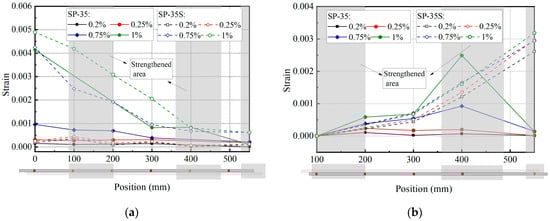 This section discusses the impact of the strengthening device on stress transfer efficiency. It has been proven that the proposed strengthening devices can improve mechanical performance, as shown in Ref. []. However, the effect on stress transfer has not yet been discussed. Figure 14 depicts a comparison of strains at heights between 0 and 550 mm along the columns for 35db specimens; the strengthened areas are marked in grey. When lap-spliced columns are subject to lateral loads, the moment gradient reaches its maximum value at the bottom of the column and gradually decrease in height, meaning that the bond strength required for the bottom rebar is much greater than that required for the top rebar. Stress transfers along a path starting from the bottom rebar and moving into the top rebar. In this test, the stress transfer efficiency can be evaluated using the rebar strains. Figure 14 shows that, for 35db specimens under the same lateral displacement, SP-35S exhibits greater strain than SP-35 at the same position. This indicates that the longitudinal rebar in the strengthened specimen is utilized more effectively. Due to the short lap-spliced length, the top rebar in the SP-35 specimen failed to transmit stress from the bottom rebar and showed greater relative slip. Conversely, with prestressing and lateral confinement, the longitudinal rebar showed less relative slip. This is consistent with the failure mode analysis of the 35db specimens (i.e., SP-35 showed splitting failure, while SP-35S showed pull-out failure, indicating greater ductility). Therefore, it can be concluded that short lap-spliced lengths fail to provide sufficient bond strength to transfer stress between lap-spliced rebars, which could lead to relative slippage between the rebars and ultimately result in a brittle splitting failure. This is in line with the conclusion provided by Kim et al. [].