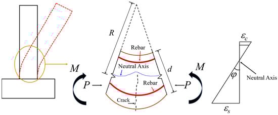 Reinforced concrete components undergo bending deformation when subjected to a combination of bending moments and axial forces. The concept of curvature, which is used to characterize the rotational ability of a cross-section, is adopted to describe changes in a member’s rotation in different zones or sections. As shown in Figure 15, R denotes the radius of curvature, kd denotes the depth of the neutral axis, εc is the strain in the compressive concrete, and εs is the strain of tensile rebar. A unit with a length of dx was selected to analyze. The relative rotation between the two end faces of the unit dx can be expressed as follows: