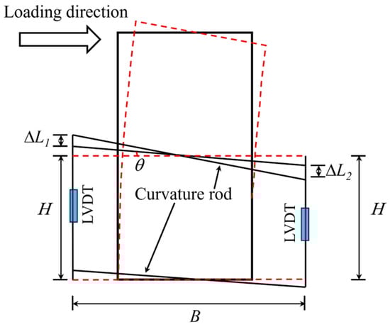 Considering that cracks in concrete can lead to errors during strain monitoring, the authors adopted a geometric method to calculate the curvature. As can be seen in Figure 16, φ is the curvature of the column within a height of H, ΔL1 and ΔL2 denote the displacement variations on the tensile and compressive sides, respectively. B is the distance between two measured points. The curvature can be calculated using Equation (10). The displacement variations ΔL1 and ΔL2, were obtained using LVDT and 2D-DIC technology.