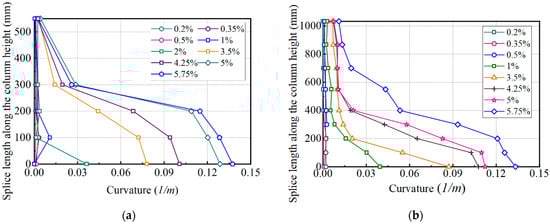 Curvature distribution along the splice length: (a) SP-35; (b) SP-60E.