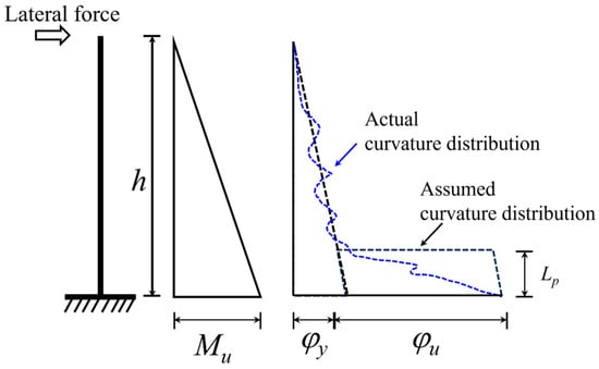 Early approaches to defining the member deformation using an equivalent rectangular plastic hinge length are summarized by Park and Paulay [], as shown in Figure 18. Before the yielding, the curvature changes linearly along the height direction of the column; after yielding, it is assumed that the plastic rotation of the column is all concentrated in the equivalent plastic hinge area. Within the plastic hinge length (Lp), the curvature is consistent of yielding curvature φy and plastic curvature φp; the plastic curvature φp distributed uniformly and can be expressed as a constant (φp = φ − φy). The displacement of the top of the column can be calculated as follows: