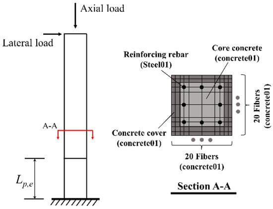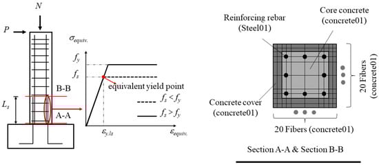 In Step 1, the cross-section analysis of two sections (i.e., the lap-spliced and non-lap-spliced sections shown in Figure 13) was carried out in OpenSees, as shown in Figure 19. For the rebar in the non-lap-spliced region, the Steel 01 model was chosen as the constitutive model. For the rebar in the lap-spliced region, a modified Steel 01 model with splice strength fs was adopted because the lap-spliced rebar with a short splice length failed to achieve the yielding stress of one continuous rebar []. The bond strength fs can be calculated using Equations (14) to (18). Further details can be found in Ref. [].