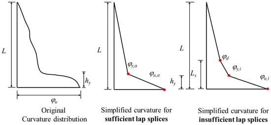 The existing modified plastic hinge model typically simplifies the curvature as a piecewise linear distribution along the column height and focuses primarily on columns with continuous longitudinal rebar. As shown in Figure 20, the authors provided two simplified curvature distributions for different splice lengths. When considering columns with insufficient splice length, the splice strength is smaller than that of one continuous rebar. Two different cross-sections should therefore be considered in the cross-section analysis: the spliced section and the non-spliced section. Generally, a plastic hinge occurs in the lap-spliced zone and the plastic hinge length is smaller than the splice length. Thus, at the intersection of the spliced and non-spliced sections, curvatures based on the two different cross-sections can be obtained. A variable φd was introduced to represent the curvature at the intersection point. φd,i and φd,a denote the curvatures of the spliced and non-spliced cross-sections at a height of ls (where ls denotes the splice length), respectively. φu,i denotes the ultimate curvature at the bottom of the column; φy,a denotes the yield curvature of the column. φd can be calculated as the average of these two parameters (i.e., φd = 0.5φd,a + 0.5φd,i).