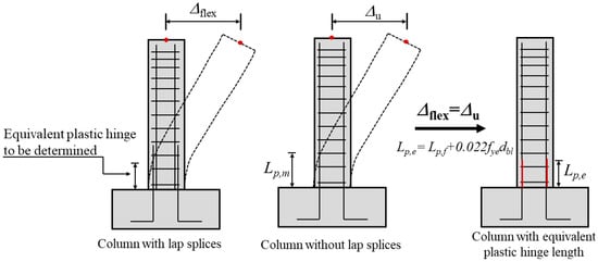 Based on the proposed equivalent curvature distribution, the curvature distribution function in relation to height φ = f(h) can be obtained; then, the ultimate displacement of the top of the column Δm, which is equal to flexural displacement Δflex, can be obtained by integrating curvatures along the height of column, as shown in Equation (21). By making an equation between Equation (21) and Equation (12), the equivalent plastic hinge length Lp,f only accounts for flexural force can be calculated as Equation (22), as shown in Figure 21. Replace 0.08Lc in Equation (20) with Lp,f, and the final expression for equivalent plastic hinge length of lap-spliced columns can be illustrated as Equation (23).