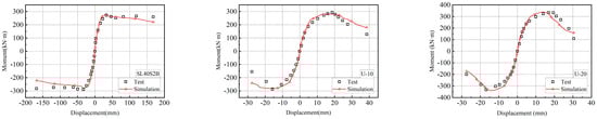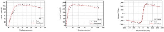 The proposed modelling method can accurately predict the load–deformation response. As shown in Figure 23, the predicted envelope curves show an acceptable level of agreement with the test curves. The model error for some parameters is greater than 10% because this method does not consider deterioration of the plastic hinge. When columns are subjected to a moderate-intensity earthquake, deterioration of the core zone at the bottom of the columns may gradually decrease their rotation capacity. Thus, subsequent studies will conduct further research to modify the proposed modelling method.