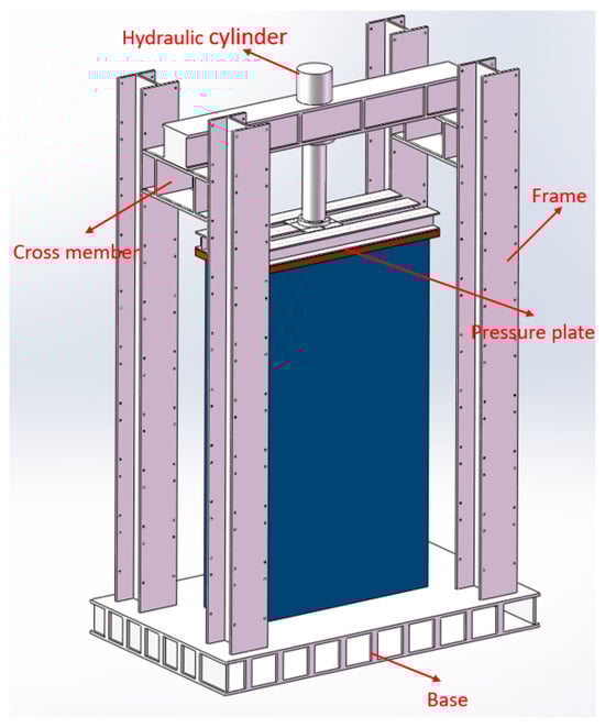 In accordance with the experimental requirements, a self-equilibrating axial loading device was designed to simulate axial force conditions under blast loading, as illustrated in Figure 2. A hydraulic cylinder was installed at the top of the specimen to apply a uniaxial downward axial load along the vertical direction of the wall, simulating the gravitational effect of upper structures. The magnitude of the axial force could be adjusted by controlling the pressure within the hydraulic system. This configuration ensured that the axial load remained constant and uniformly distributed during the blast event.