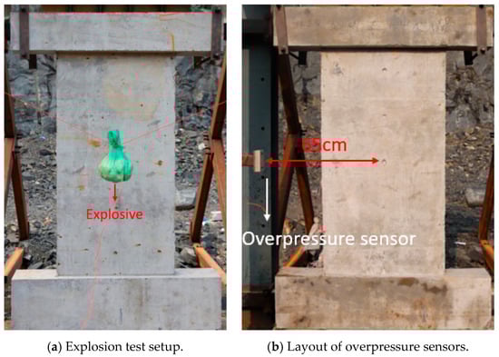 Due to the destructive nature of near-field and contact blast loading, pressure sensors placed too close to the charge may suffer damage, leading to inaccurate or lost data and increased testing costs. To address this issue, a pressure sensor was installed 65 cm to the left of the explosive charge to indirectly capture pressure information, as illustrated in Figure 3b.