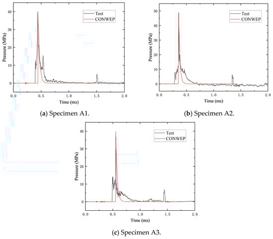 According to the UFC 3-340-02 guidelines, the CONWEP model was used to estimate the theoretical peak overpressure for comparison with measured results. This model is based on empirical data from spherical TNT explosions and provides a standard approach to blast load prediction [37]. Table 4 compares the peak reflected overpressures obtained from experimental measurements and CONWEP calculations. The discrepancies between the CONWEP results and the experimental measurements were all within 10%, indicating good agreement.