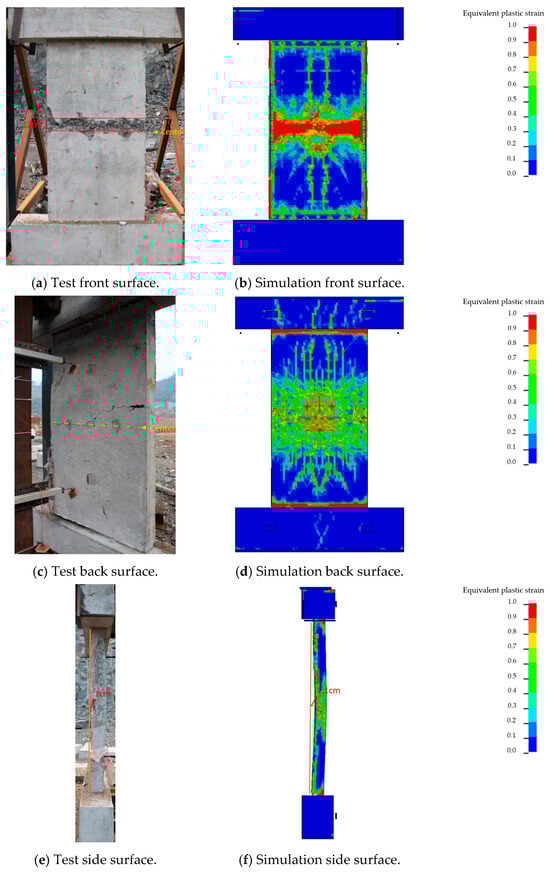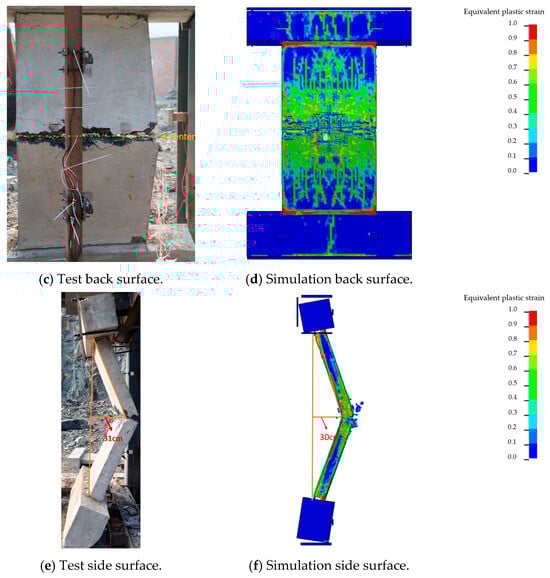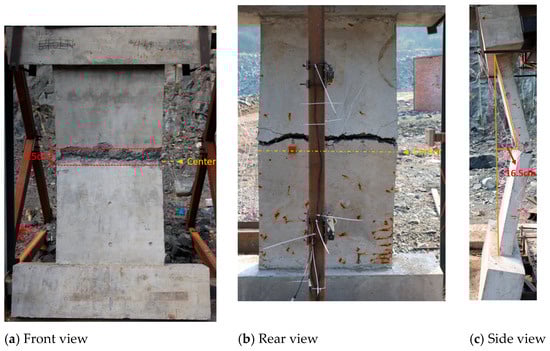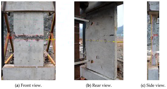 On the rear face, a horizontal fracture zone was located approximately 10 cm above the central axis. Cracking was primarily concentrated below this fracture line, and reinforcement in the horizontal rupture zone was fractured. The overall failure mode was identified as flexural–shear. Cracks were also observed in the upper region of the wall.