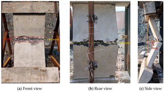 The overall failure mode was characterized as flexural–shear. Prominent delamination was observed in the upper region, and a large residual out-of-plane displacement of 31 cm occurred at mid-span, with a support rotation angle of 22.4°. Although partial reinforcement continuity remained, the wall was effectively severed at the center and had lost its structural integrity.