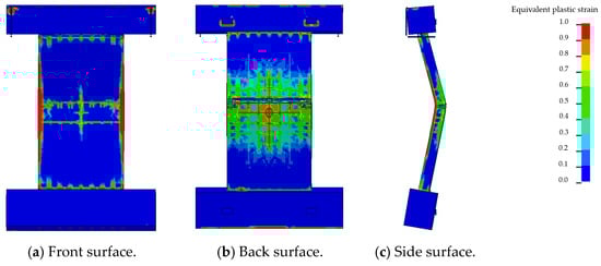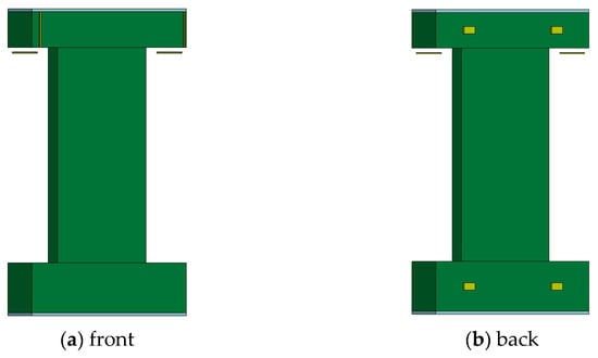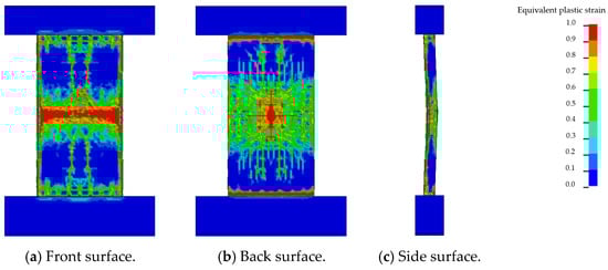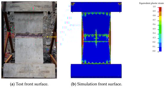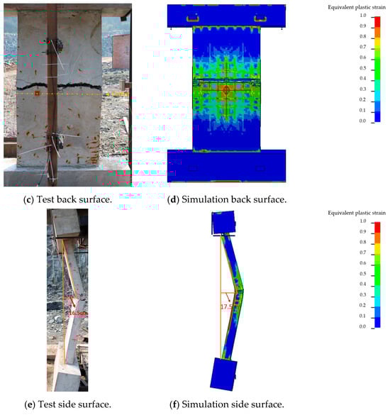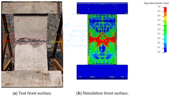 The *AUTOMATIC_SURFACE_TO_SURFACE algorithm refers to a general surface-to-surface contact method used in finite element analysis to define mechanical interactions between contacting parts. The contact interaction between the steel plates and the concrete wall surfaces was defined using the *AUTOMATIC_SURFACE_TO_SURFACE contact algorithm to accurately simulate the constraints at the top and bottom boundaries. By replicating the experimental clamping setup in the numerical model, similar boundary conditions were ensured, thereby enhancing the comparability between the simulation and test results, as shown in Figure 9.