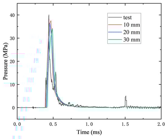 Mesh sizes of 10 mm, 20 mm, and 30 mm were tested, as shown in Figure 10. The simulation errors for 10 mm and 20 mm meshes were 6.3% and 9.3%, respectively, while the 30 mm mesh yielded a 15% error. To balance computational efficiency and accuracy, a mesh size of 20 mm was selected for the air domain, while a finer mesh of 10 mm was used for the concrete and reinforcement. This ensured both accurate stress wave propagation and reliable capture of localized structural responses.