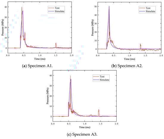 Figure 4 presents the time history of the reflected overpressure caused by the blast loading. The results show that the pressure rises sharply upon the arrival of the shock wave at the sensor, followed by an exponential decay over time. Additionally, there is a hump in the overpressure, which is caused by the detonation waves reflected from the expanding detonation products. This phenomenon is particularly prominent under conditions of close-in detonations with relatively large charge weights [18,36].