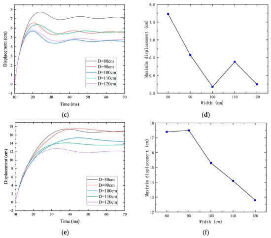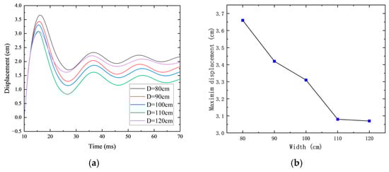 For the RC shear wall model with a width of 100 cm (discussed in Section 4.2), the fitted curve in Figure 13 can be used to predict the maximum displacement at the wall center for TNT charge weights ranging from 0 to 4.2 kg.