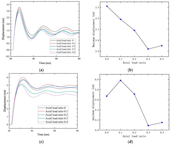 (4) Moderate axial compression ratios (around 0.3) improve stiffness and reduce displacement, effectively helping to control wall damage. However, excessive axial compression (>0.3) increases brittleness and the likelihood of sudden failure under blast loading.