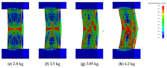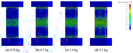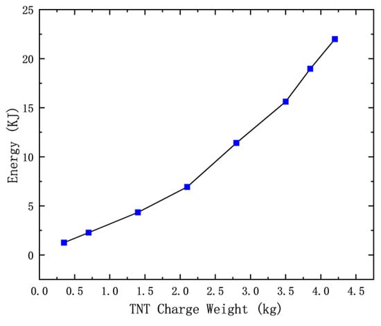 Figure 25 presents the relationship between the absorbed internal energy and TNT charge weight. As the explosive charge increases, the internal energy absorbed by the wall also increases nonlinearly. This trend indicates that more energy is transferred into the structure during higher-intensity blasts, leading to more significant plastic deformation and damage. The absorbed energy can be used as a quantitative indicator of the wall’s damage level, providing a complementary metric to displacement-based assessments.