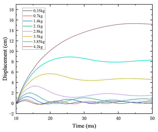 Figure 22 presents the displacement–time curves at the center of the reinforced concrete shear wall under different scaled distances. As the blast occurred, with the standoff distance kept constant, the increase in TNT equivalent resulted in a decrease in scaled distance, leading to a larger maximum displacement at the wall center. Additionally, the time required to reach the peak displacement increased with the charge weight.
