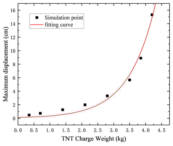 Figure 23 further illustrates the relationship between peak central displacement and TNT charge weight. A curve is fitted using the least squares method , where represents the peak displacement and is the charge weight, as shown in the figure. The coefficient of determination () is 0.982, indicating a strong correlation and a good fit.