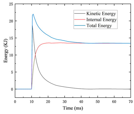 To better interpret the damage mechanisms, Figure 24 illustrates the time–history evolution of kinetic energy, internal energy, and total energy under the 4.2 kg TNT blast scenario. Immediately following the detonation, the kinetic energy rapidly peaks and is subsequently converted into internal energy as the shear wall undergoes deformation. The total energy remains nearly constant throughout the simulation, indicating that energy conservation is well maintained. The progressive rise in internal energy represents the energy absorbed by the structure through plastic deformation and cracking, which aligns with the observed damage patterns.