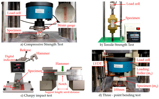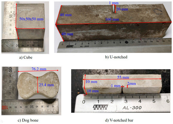 For compressive and tensile strength tests, three cube samples and three dog-bone samples were prepared for each mix ratio. For the U-notched beam samples, three samples for each ratio were prepared to perform three-point bending tests. In total, 15 samples of each type were prepared for the tests. These samples were cured at room temperature (23 ± 2 °C) and atmospheric pressure for 28 days.