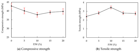 The results of the compressive strength and tensile strength tests of the cement paste at 28 days of curing are presented in Figure 3 and Table 3. The experimental results show several trends when evaluating the effect of the polymer-to-water (P/W) ratio on the mechanical properties of the cement paste. In general, the compressive strength of the cement paste tends to decrease, while the tensile strength tends to increase when using modified SBR latex in the cement paste.